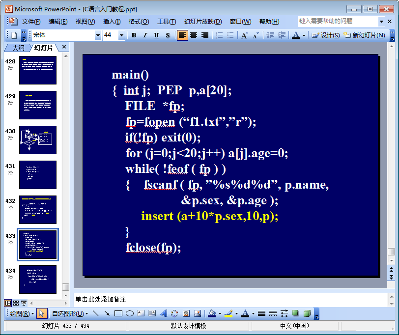 这是一份以ppt形式展现的C语言入门教程,该C语言入门教程ppt共由434页组成,内容包括计算机语言与C语言概述、算法、数据类型、运算符与表达式等,是一份非常不错的学习c语言的资料,如果你需要c语言学习ppt或是C语言入门教程,那么就快来东坡下载将这份C语言入门教程ppt收入囊中吧!相信它不会让你失望的!