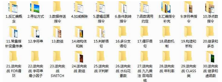本套教程共分30节课,1-10汇编基础,11-20反汇编基础,21-30实战逆向.教程以C++反汇编为主