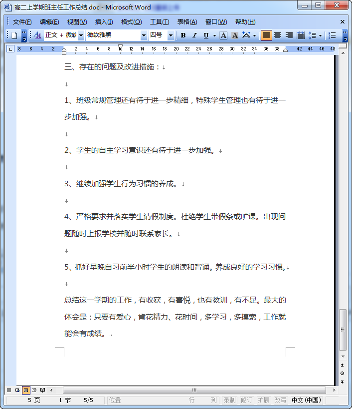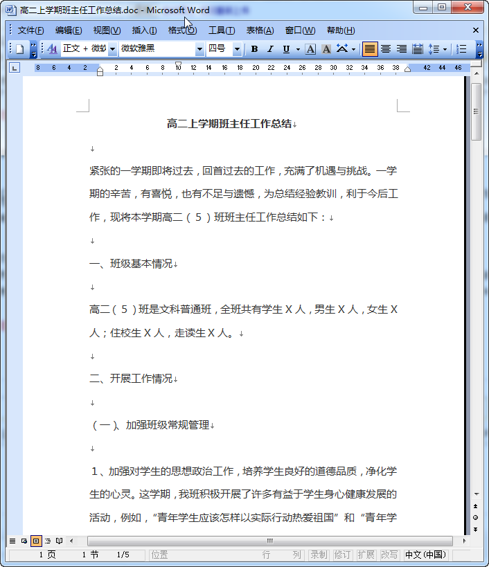 紧张的一学期即将过去,回首过去的工作,充满了机遇与挑战。一学期的辛苦,有喜悦,也有不足与遗憾,为总结经验教训,利于今后工作,现将本学期高二(5)班班主任工作总结如下
