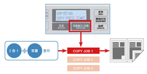 多达三个常用功能,复杂的复印 / 扫描设置可以编程到快速工作键,重复工作仅需轻触按键,这既节省了您的时间,也减去了您的麻烦。编程您常用的 2 合 1 加双面打印功能的组合复印设置。您可以选择相应的快速工作键迅速地、准确无误地随时调用和执行相应的程序,而无需每次都重复相同的步骤。