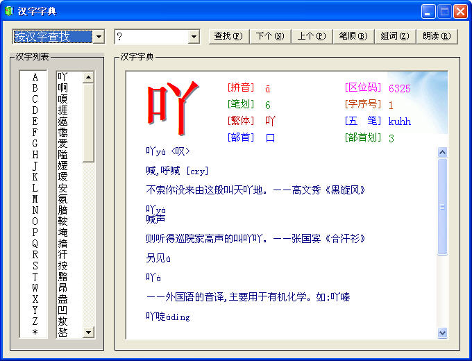 包括汉字字典和编码查询两大功能。收录20907个汉字,可按汉字、拼音、部首、笔画、结构查找,独具难检字、手写输入、按汉字起笔笔画、汉字拼音首字母检索功能和汉字笔顺练习、字体显示功能,查找信息全面详细,可查汉字的拼音、笔画、笔顺、繁体字、区位码、五笔、郑码输入码、汉字释义和汉字的常见词组等,同时还带有五笔字根图。