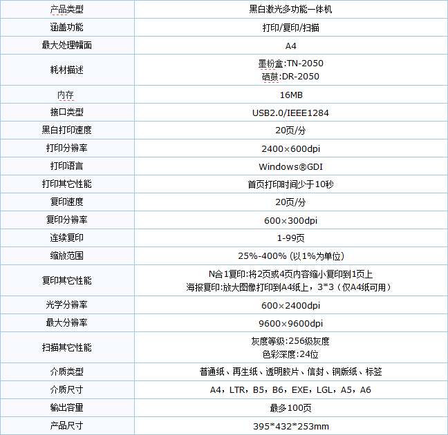 兄弟DCP7010是一款针对小型企业用户而推出的多功能一体机,具有打印、复印、扫描三种功能,同时价格低廉,性价比非常高。DCP7010多功能一体机的打印分辨率最高可以优化到2400×600DPI,打印速度高达每分钟20页,具有250页的进纸盒,为完成办公室里较多的打印任务量提供了有效的保证。