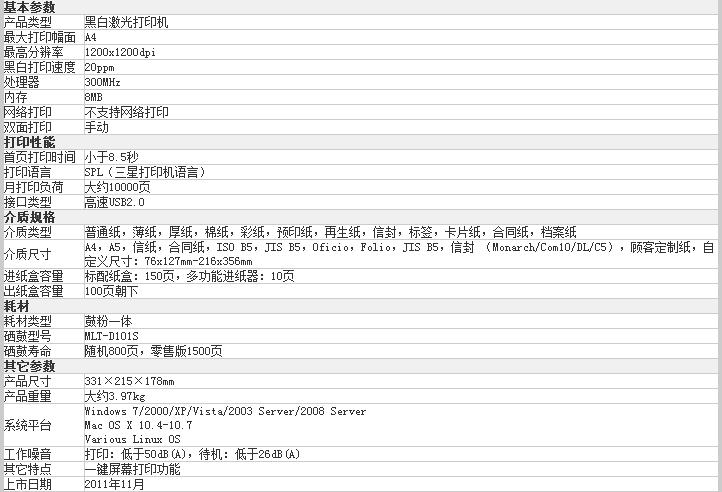 三星SAMSUNG ML-2161打印机基本参数