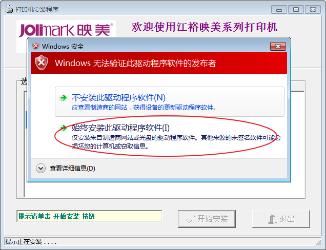 下载解压后,在文件夹根目录下找到Setup.exe文件,双击打卡会出现如上图所示界面,然后点击开始安装,会弹出对话框,点击“是”即可,然后,系统会弹出Windows安全的对话框,点击下面红圈标注的地方,可继续进行驱动安装,如点击上面的,则驱动安装程序会被终止。安装完成后连接上打印机方可使用。此驱动为官方版,请放心安装。