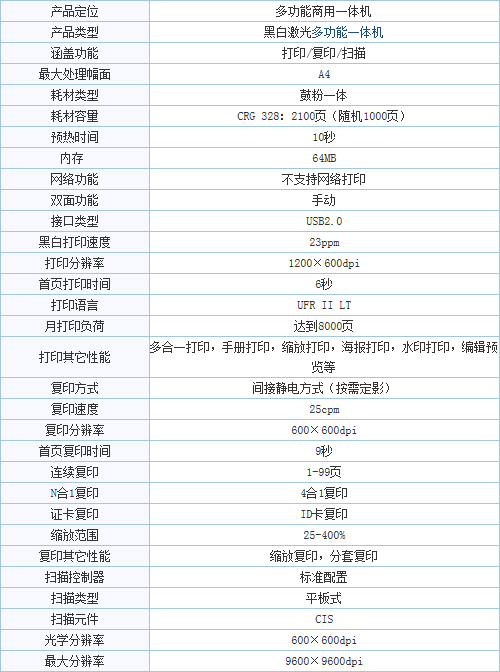 佳能MF4410是一款多功能商用一体机,23页/分钟的打印复印速度很不错,且打印效果非常清晰。另外其多合一打印,手册打印,缩放打印,海报打印,水印打印等功能更能全面满足用户的需求。借助佳能CIS接触式彩色图像扫描技术可轻松实现彩色文档的电子保存需求。另外其可靠的激光技术及数字图像优化技术,也可实现9600dpi×9600dpi(增强)超高精度扫描质量。