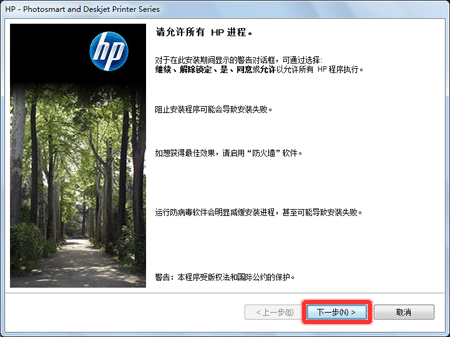 3、在“请允许所有 HP 进程。”窗口中,点击“下一步”按钮。如图 2 允许安装进程所示: