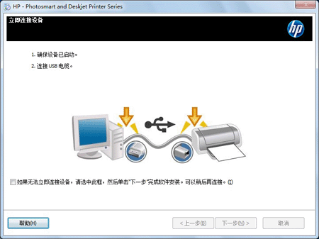 5、在“立即连接设备”窗口中,请使用 USB 连接线将打印机和电脑连接,并且开启打印机电源,驱动程序会自动检测连接的设备。如图 4 连接设备所示: