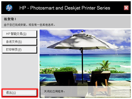 9、在“HP - Photosmart and Deskjet Printer Series”窗口中,点击“退出”按钮。如图 7 退出所示: