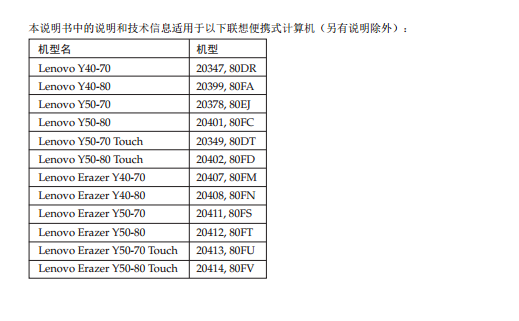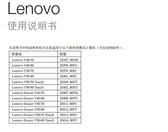 这里小编给大家带来的是联想Y40-70 Y40-80 Y50-70 Y50-80使用说明书,适合型号为Lenovo Y40-70 Y40-80 Y50-70 Y50-80、 Y50-70 Touch 、Y50-80 Touch 、Lenovo Erazer Y40-70 Y40-80 Y50-70 Y50-80、 Y50-70 Touch 、Y50-80 Touch,有需要的朋友可以下载联想Y40-70 Y40-80 Y50-70 Y50-80说明书查看详细的内容。