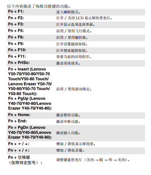 联想Y40-70 Y40-80 Y50-70 Y50-80每组功能键的功能