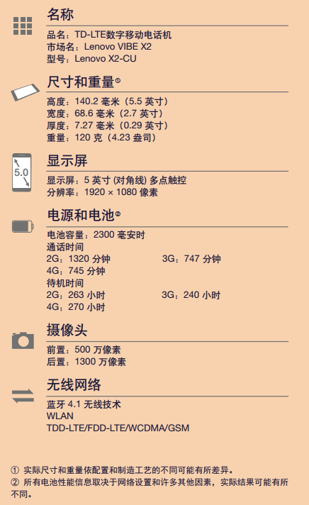 联想X2-CU采用联发科八核处理器,1080x1920分辨,500万像素置摄像头,1300万像素后置摄像头,2GB内存和16 GB/32 GB内部存储。这里给大家带来的是联想X2-CU使用说明书,有需要的朋友可以下载联想X2-CU说明书查阅详细的内容。