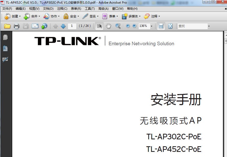 TL-AP452C-PoE是一款外观小巧,安装灵活简便的无线路由器,可吸顶或者壁挂,802.3af/at标准PoE供电,无线发射功率线性可调,根据需求调整信号覆盖范围,支持8个SSID,轻松划分无线网络,内置独立硬件保护电路,可自动恢复工作异常AP,维护简单。以下文档是TL-AP452C-PoE安装手册,有需要的朋友可下载此文档。
