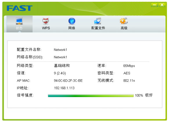 如下图所示点击状态按钮,将出现网卡连接状态相关的信息,包括配置文件名称、网络名称,以及网络类型、速率、信道、密码类型、AP MAC、无线模式、IP地址、信号强度等。无需进行任何设置。