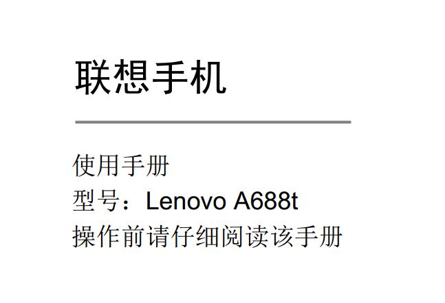 联想Lenovo a688t采用5英寸1280×720像素的电容触摸屏,配置1GB的RAM内存+4GB的ROM内存,前置200万像素+后置800万像素的摄像头,下面给大家带来的是联想a688t使用说明书(Lenovo a688t使用手册),有需要的朋友可以下载联想a688t说明书。