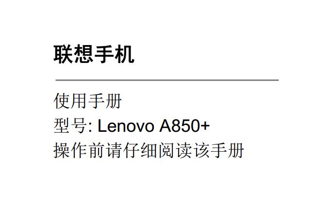 联想Lenovo a850+,采用5英寸HD屏幕,主屏幕960×540像素,前置30万像素+后置500万像素的摄像头,下面给大家带来的是联想a850+手机使用说明书(Lenovo a850+使用手册),有需要的朋友可以下载联想a850+说明书。