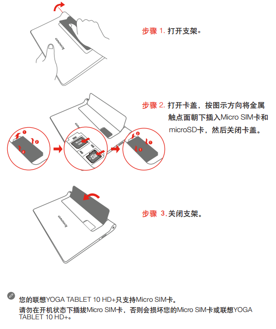 WLAN + 3G 版本的联想YOGA TABLET 10 HD+(Lenovo B8080-H(V) )支持3G网络。使用3G网络前需要安装运营商提供的Micro SIM卡。按照如图所示的方法安装Micro SIM卡和microSD卡。