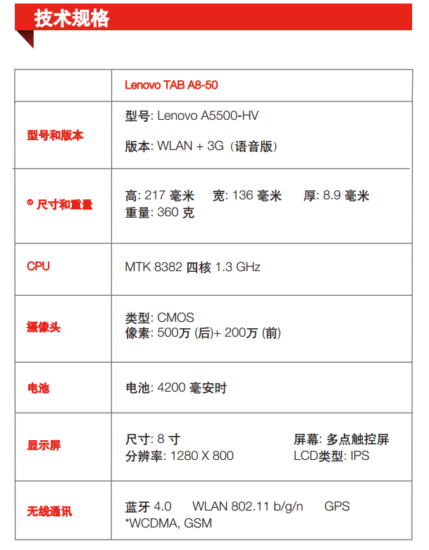 这里给大家带来的是联想Lenovo TAB A8-50 A5500平板电脑使用说明书,一个是网页版的详细说明,一个似乎pdf版的快速入门指南,有需要的朋友可以下载联想a5500说明书 查阅详细的内容。