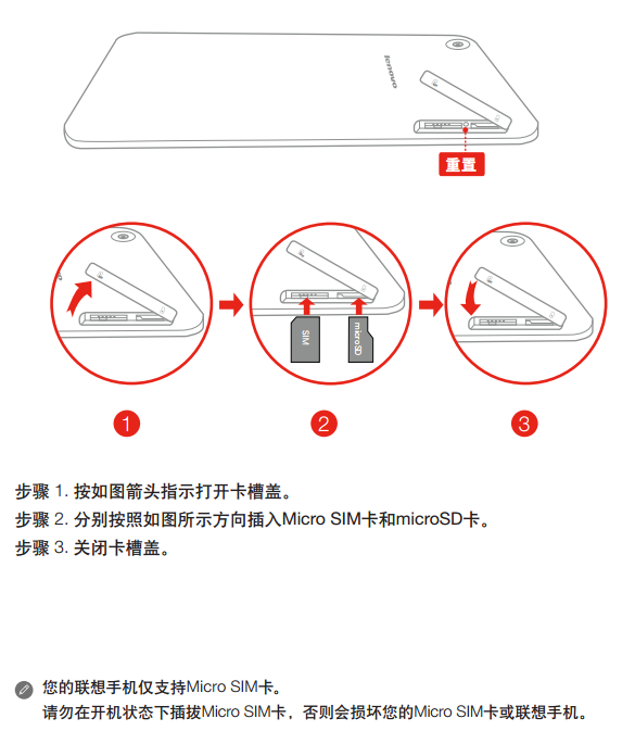 使用3G网络前需要安装运营商提供的Micro SIM卡。按照如图所示的方法安装Micro SIM卡和microSD卡。