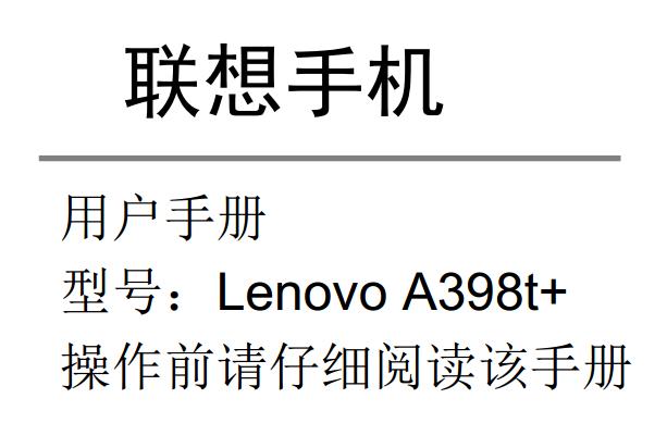 联想Lenovo A398t+手机配有4.5英寸的显示屏,分辨率为854x480像素。前置30万像素+后置500万像素的摄像头。下面给大家带来的是联想A398t+手机使用说明书,有需要的朋友可以下载联想A398t+说明书查看详细内容。