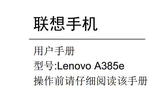 联想Lenovo a385e手机配有4.5英寸的显示屏,分辨率为854x480像素,512MB的RAM+4GB的ROM,后置200万像素的摄像头。下面给大家带来的是联想a385e手机使用说明书(Lenovo a385e),有需要的朋友可以下载联想a385e说明书查看详细内容。