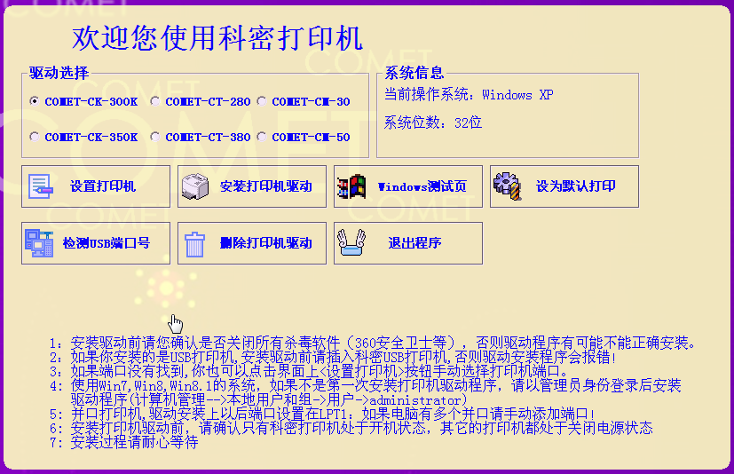 科密票据打印机驱动程序能完美驱程COMET-CM-30的票据打印机,有需要的用户可以下载驱动程序安装。压缩包内包含win32位和win64位的驱动,请用户根据自身系统选择对应的驱动包进行安装。
