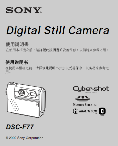 本节内容小编要和大家分享的是Sony索尼DSC-F77数码相机使用指南(pdf格式说明书),有需要的朋友可以进行下载查阅哦!
