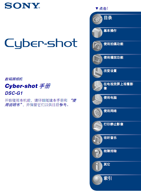 本节内容小编要和大家分享的是Sony索尼DSC-G1用户手册(pdf格式说明书),有需要的朋友可以进行下载查阅哦!