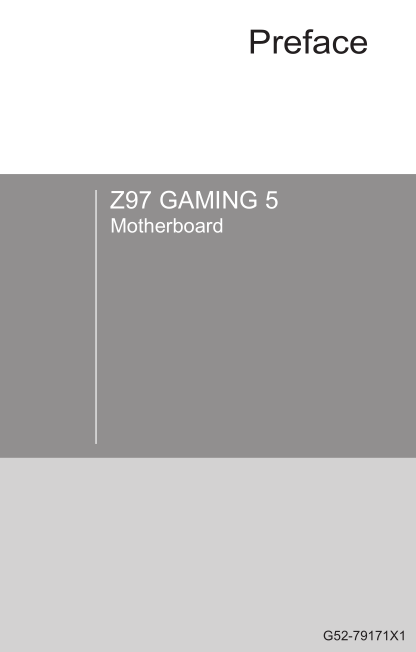 微星Z97 GAMING 5主板支持Socket 1150架构的第四代及第五代Intel® Core™ / Pentium® / Celeron® 处理器,USB独立供电设计:,提供更干净优质的USB音效,Sound Blaster Cinema,可获得逼真的立体环绕音效体验。以下文档是微星Z97 GAMING 5用户手册,为英文版,有需要的朋友可立即下载此文档。