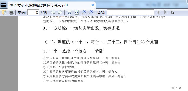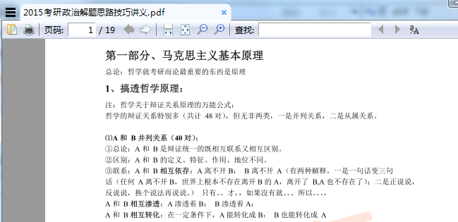 距离2015考研政治开考的时间还有半个月左右的时间,除了巩固考点知识点,多做预测题,真题外,还可以掌握一些解题方法和技巧。今天小编就和大家分享一下2015考研政治解题思路技巧讲义,为石磊老师精心编写的,有需要的朋友可立即下载此文档。