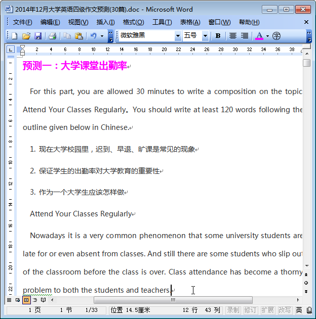 本周六将会迎来2014年12月大学英语四六级考试,正所谓“四(六)级虐我千百遍,我待它们如初恋”,不知道小伙伴们的备考工作准备得怎么样了呢?Anyway,东坡下载站的小编预祝大家都能愉快地通过考试!本节内容中,东坡小编为大家带来的是doc格式免费版word文档——2014年12月大学英语四级作文预测(最新版英语四级作文范文),有需要的小伙伴不妨下载下来参考参考吧!