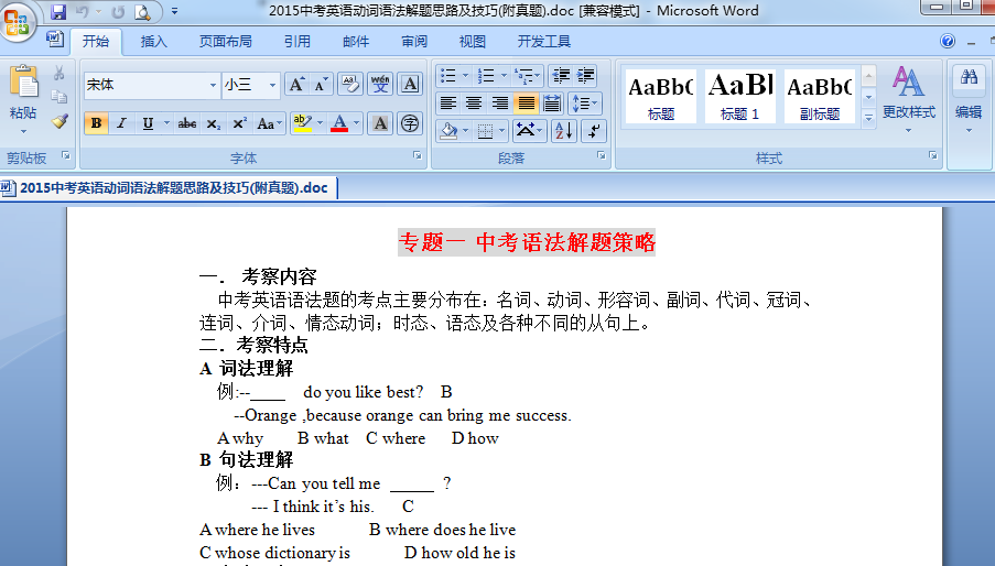 学习英语莫过于熟记单词,语法,大家在做英语动词训练题时,是怎么快速找到答案的,其实可以运用一些小技巧。今天小编想和大家分享的是2015中考英语动词语法解题思路及技巧,附带历年中考英语语法真题,为doc格式,有需要的朋友可立即下载此文档。