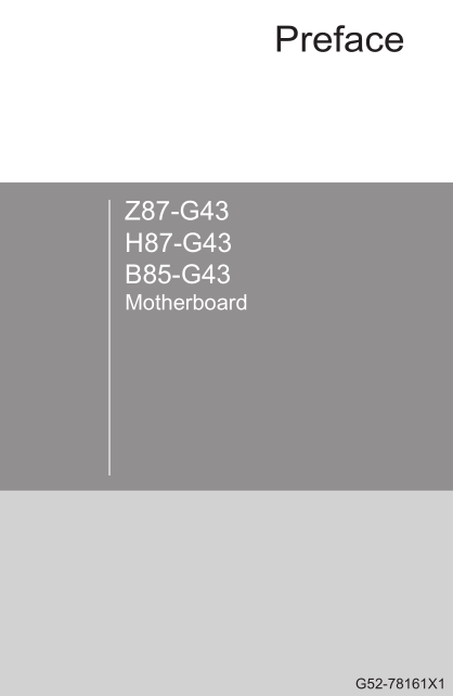 微星Z87-G43主板支持OC Genie 4,全自动1秒超频,免设定效能全面提升,使用Sound Blaster Cinema,可获得逼真的立体环绕音效体验。以下文档是微星Z87-G43,H87-G43,B85-G43主板使用说明书,为英文版,有需要的朋友可立即下载此文档。