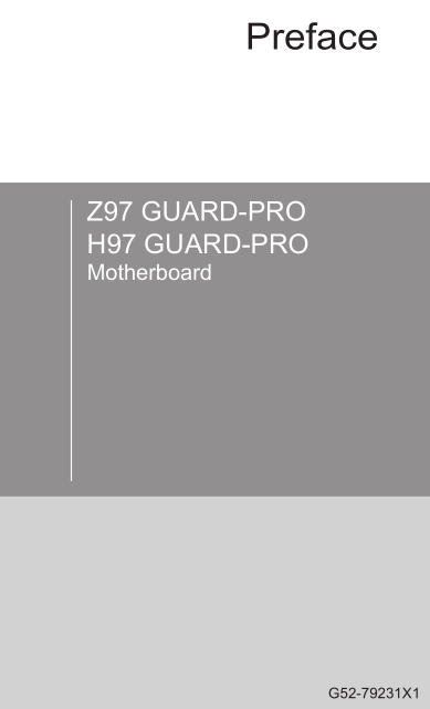微星Z97 GUARD-PRO主板采用集成Realtek ALC892 8声道音效芯片,Realtek 8111G千兆网卡,支持AMD CrossFireX混合交火技术,使用户获得更好的体验。以下文档是微星Z97 GUARD-PRO和H97 GUARD-PRO主板使用说明书,为英文版,有需要的朋友可立即下载此文档。