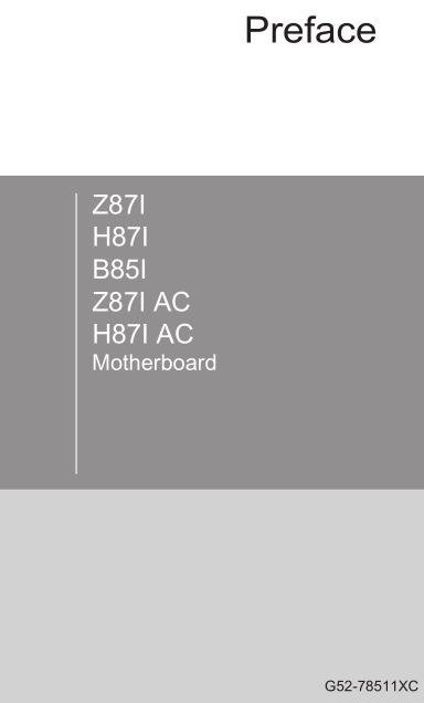 微星Z87I主板采用Intel Z87芯片组,CPU内置显示芯片,支持双通道DDR3 3000,Mini-ITX板型,拥有一个4针,一个24针电源接口。以下文档是微星Z87I,H87I系列主板使用说明书,为英文版,有需要的朋友可立即下载此文档。