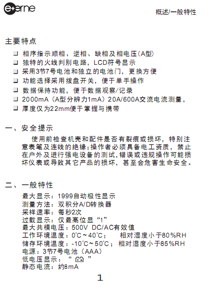 相序指示顺相、逆相、缺相及相电压(A型);独特的火线判别电路,LCD符号显示;采用3节7号电池和独立的电池门,更换方便;功能选择采用拨盘开关,便于单手操作数据保持功能,便于数据观察/记录厚度仅为22mm便于掌握与携带