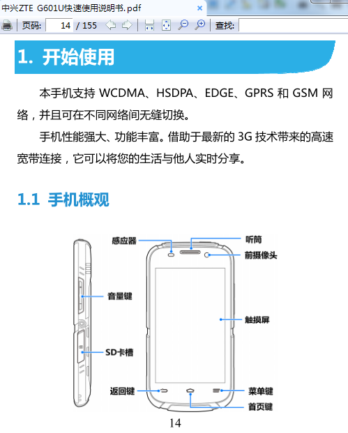 中兴ZTE G601U是一款4英寸3G智能手机,Android OS 4.2操作系统,双核处理器,前后双摄像头,支持AMR/AAC/MP3/MIDI/WAV/OGG等格式。以下文档是中兴ZTE G601U使用说明书,有需要的朋友可立即下载此文档。