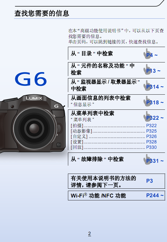 本节内容小编为大家精选带来的是简体中文版松下G6相机用户使用手册(pdf格式松下g6说明书),本pdf格式松下g6电子版说明书共分为356页,详细介绍了松下G6相机的使用方法及使用注意事项,有需要的朋友点击本文下方的下载地址进行下载即可。