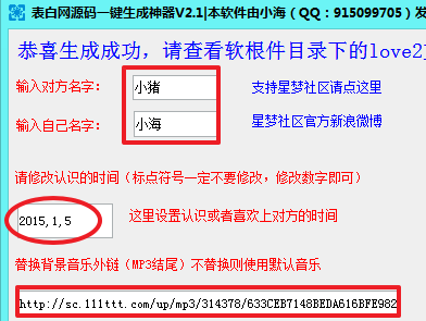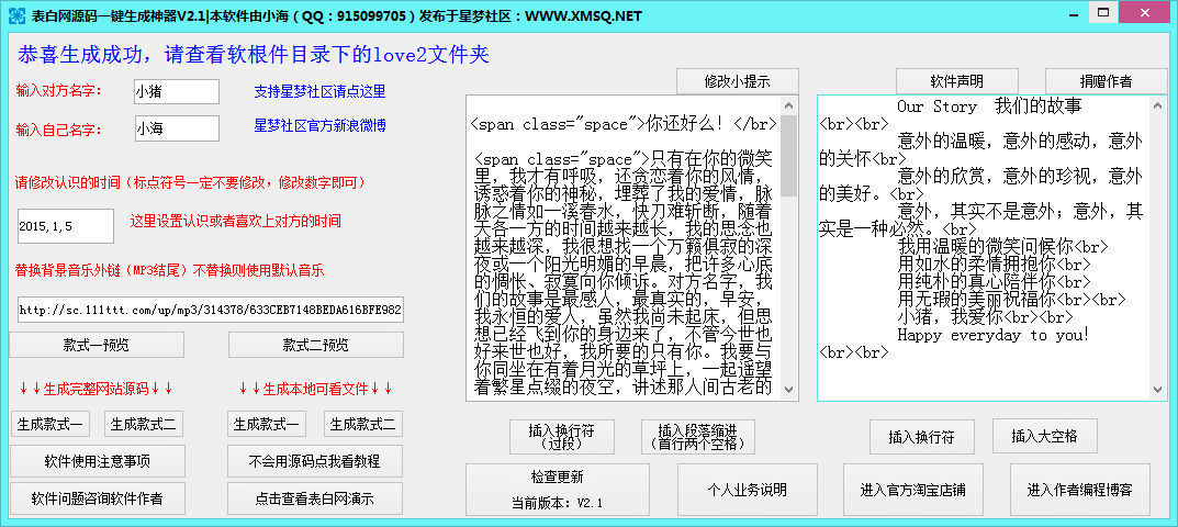 表白网源码一键生成神器是一款绿色免费的2015最新版表白网页生成器。软件只为不懂如何示爱的你而制作,软件可直接生成网站源码,可自行编辑文字内容,把你想对她或他说的话,依托软件表达出来。2015,要表白的你,准备好了吗?