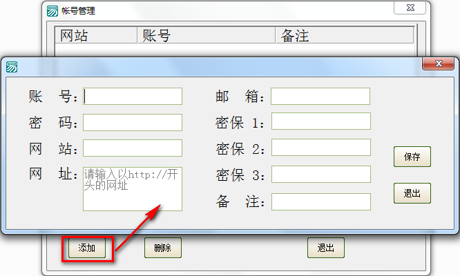登录完成后,点击添加可以对账号进行设置,输入的网址双击就可以直接打开网站。