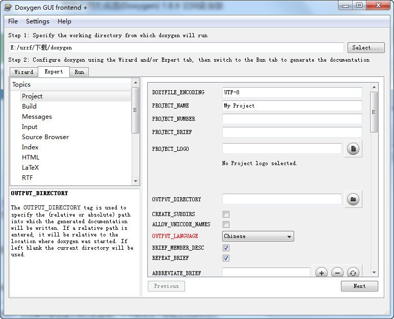 Project/OUTPUT_LANGUAGE:输出语言。这里是指Doxygen自己生成的导航、提示、帮助等文本的文字采用的语言。我们希望帮助文档是全中文的,所以选择Chinese