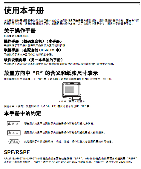 本节内容小编为大家精选带来的是pdf格式高清中文版SHARP夏普复印机AR2718说明书,本说明书详细介绍了夏普复印机AR2718的使用方法及使用注意事项,如果你想对夏普复印机AR2718有进一步的了解或是掌握更多关于夏普复印机AR2718的使用技巧,那就赶紧点击本文下方的下载地址进行下载查阅这份夏普复印机说明书吧!