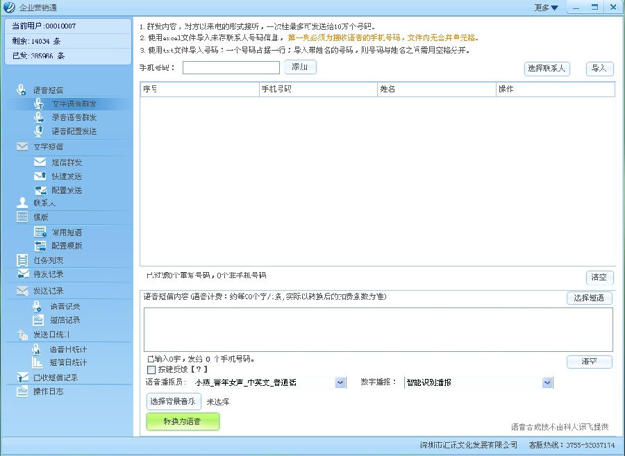 企业营销通是一款企业营销软件,软件能语音群呼营销平台,旨在为企业提高营销效率,通过营销平台快速发送语音群呼、群发短信,同时也具有文字转语音、上传音频文件、真人录音、配置背景音乐、语音/短信批量配置发送等功能。适用于所有行业推广或服务推广需求,致力为企业拓展多渠道发展。通过在线精准语音平台,群呼潜在客户,短信同步推广三重营销于一体筛选潜在意向客户群体,以最低的开拓成本,精确寻找最直接的目标用户,全面实现市场营销!