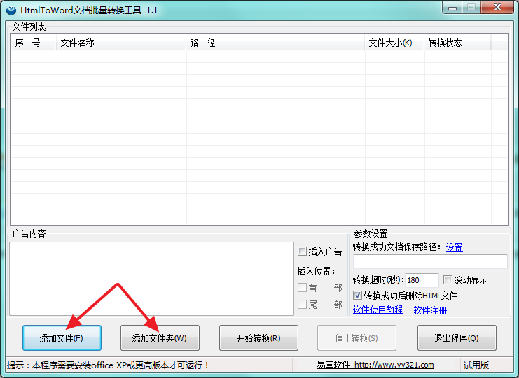 HtmlToWord文档批量转换工具是一款绿色免费、小巧简洁的Ttml转Word工具。该工具可以批量转换Html文档,日转换量可达5万个,高效、便捷;同时,软件支持在Word文档中添加链接、广告代码等,方便推广营销。欢迎下载使用!