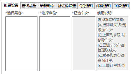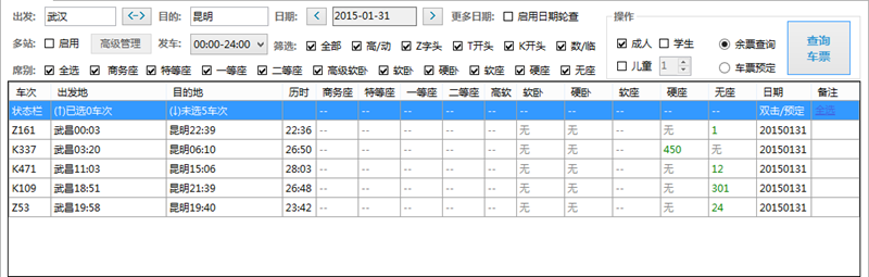 输入出发地-目的地,选择乘车日期,查询余票,然后加载到列表.