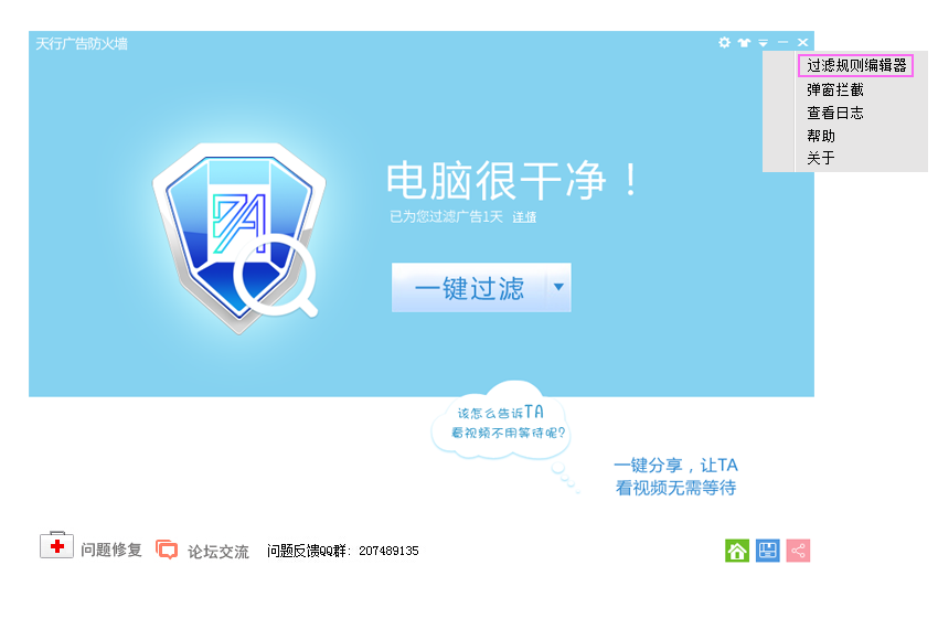 不良信息、网站骚扰、视频广告、自定义过滤一键选择.