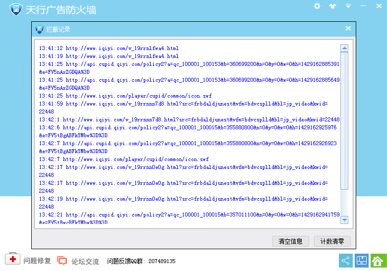 广告拦截日志,可以查看天行广告防火墙 具体拦截了哪些内容。如下图所示: