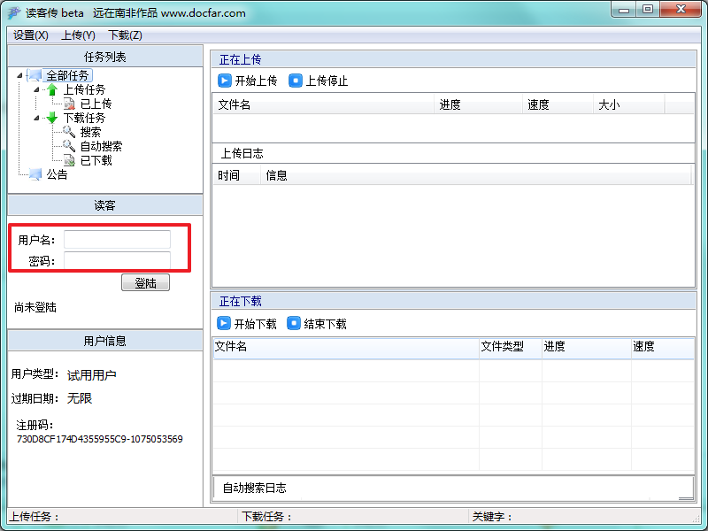 读客传是一款绿色免费的专门用于读客网的文档批量上传、下载软件。该软件可以在不打开IE的情况下批量上传自己的文档(包括任何官方许可的格式),同时能够为单个上传文档设置文档的价格、分类、标签、简介等。上传速度快,占用资源小,可长期后台运行。欢迎下载使用!