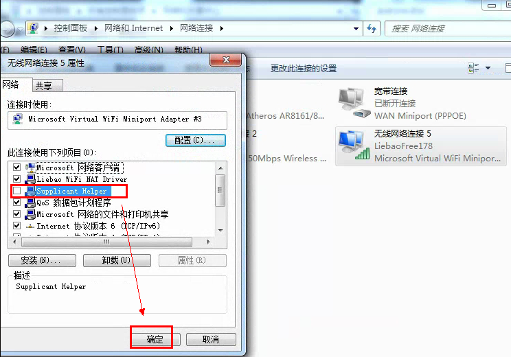 2、然后把Supplicant Helper前面的勾选去除,确定,然后重启一次猎豹免费wifi,然后手机连接上就