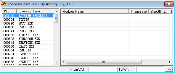 在列表中选左边的进程栏,当右边出现模块栏时,双击你要查看的模块可以得到PE信息,可以同时查看多个。要反汇编的话,在状态栏有却省的合法地址,你可以定制你的地址,然后按“GO!”就进行反汇编了。也可以同时反汇编多个文件。