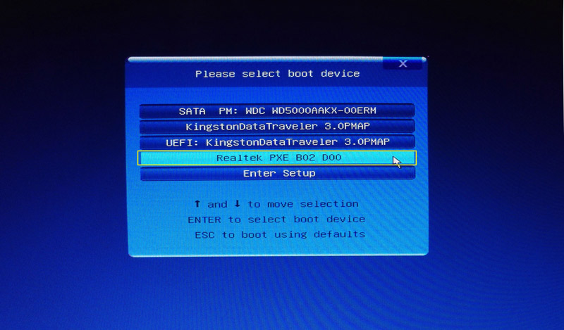 你也可以重新启动计算机并投中一个关键的(可能是F12或F11),然后会弹出下面的窗口,然后选择第一启动设备:“Realtek PXE B02 D00”并按回车。